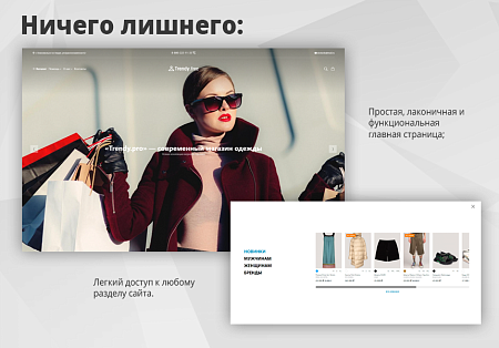 Наконец, в хорошем шаблоне магазина одежды всегда есть быстрый просмотр - карточка заказа открывается как всплывающее окно на странице раздела. Таким образом, покупатели могут детально рассмотреть фотографии, ознакомиться с характеристиками конкретной вещи и добавить ее в «Корзину», не переходя на страницу товара.